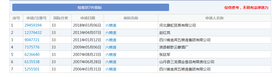 前兩天,邊肖在中國商標(biāo)局官網(wǎng)查詢。結(jié)果她驚喜地發(fā)現(xiàn)“六糧液”,而且已經(jīng)進(jìn)入初審公告期。在查詢33種白酒商標(biāo)時(shí),檢索到以下7條信息,均注冊為“六糧液”商標(biāo)。只有兩條信息顯示“六糧液”商標(biāo)的申請人為五糧液集團(tuán),其余均為他人申請。
